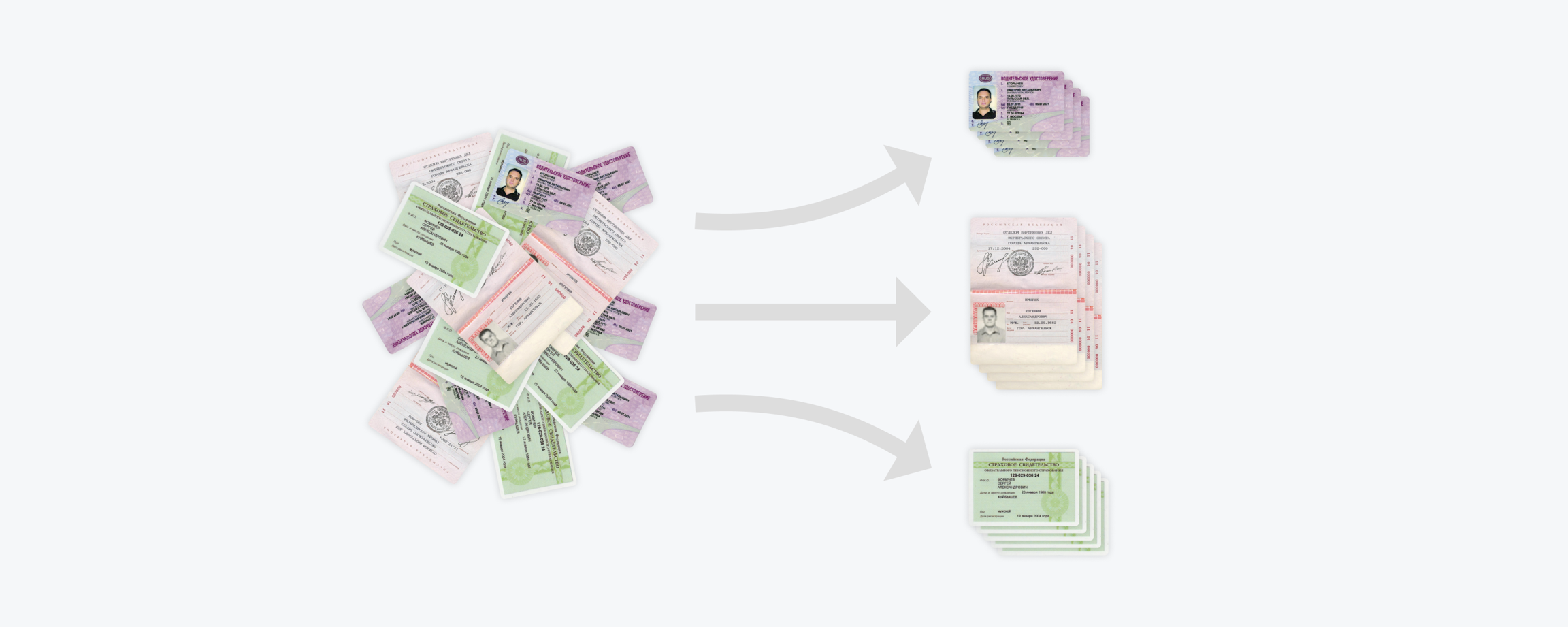 Находит на изображении все документы, даже если на одном скане присутствуют сразу паспорт, СНИЛС и водительские права.