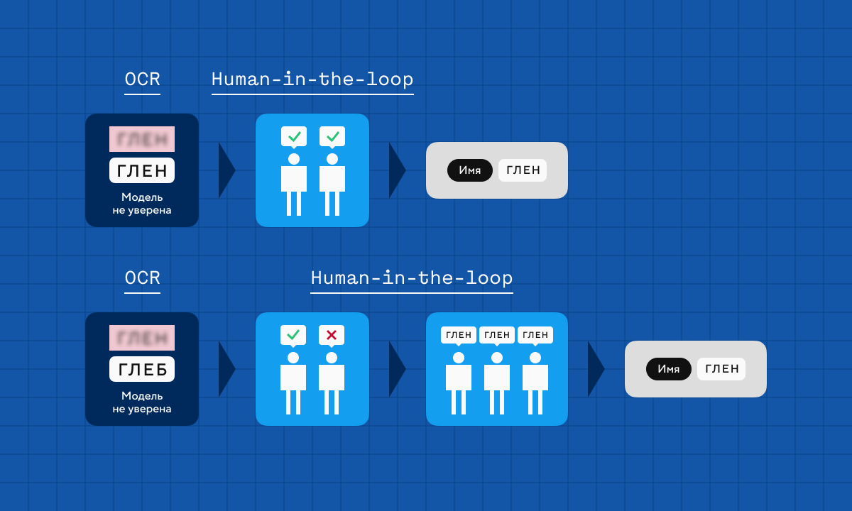 Human-in-the-loop (человек-в-контуре) — дополнительный модуль верификации результатов распознавания и ручного ввода сложных случаев. Модуль доступен как в облачной, так и в локальной версии Dbrain. В качестве платформы разметки используется Яндекс.Толока. На платформе зарегистрированы более 1 млн исполнителей, ежемесячно активны онлайн 245 тысяч. Большое число исполнителей позволяет модулю HITL обрабатывать запросы в режиме online в любое время суток.